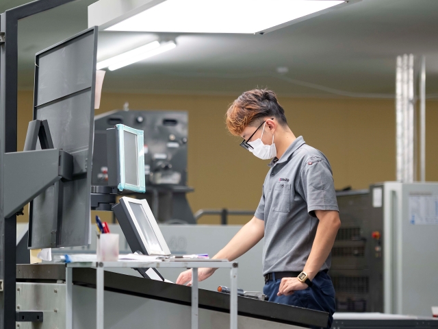 「カラーの印刷物に関しては、美術印刷のような“絶対的な色のきれいさ”よりも、色がつねに安定していること、微細な汚れの付着がないことなど、工業製品としての品質の高さが求められるので、日頃の品質管理や検品体制が重要になります。しかも、リピート物も多いので、前回印刷したものと差が出ないよう、色の変動にはとくに注意を払っています」(川口マネージャー)