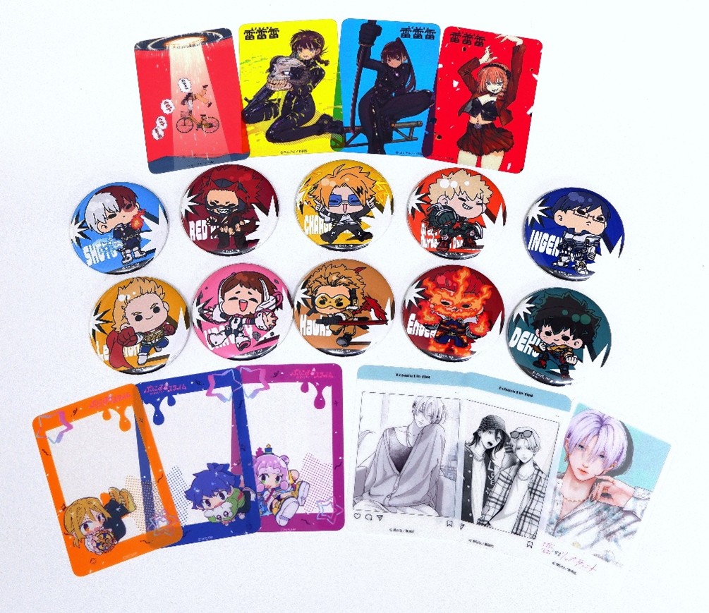 PC1120で出力した缶バッジ、クリアカード。さまざまな素材で鮮やかな
